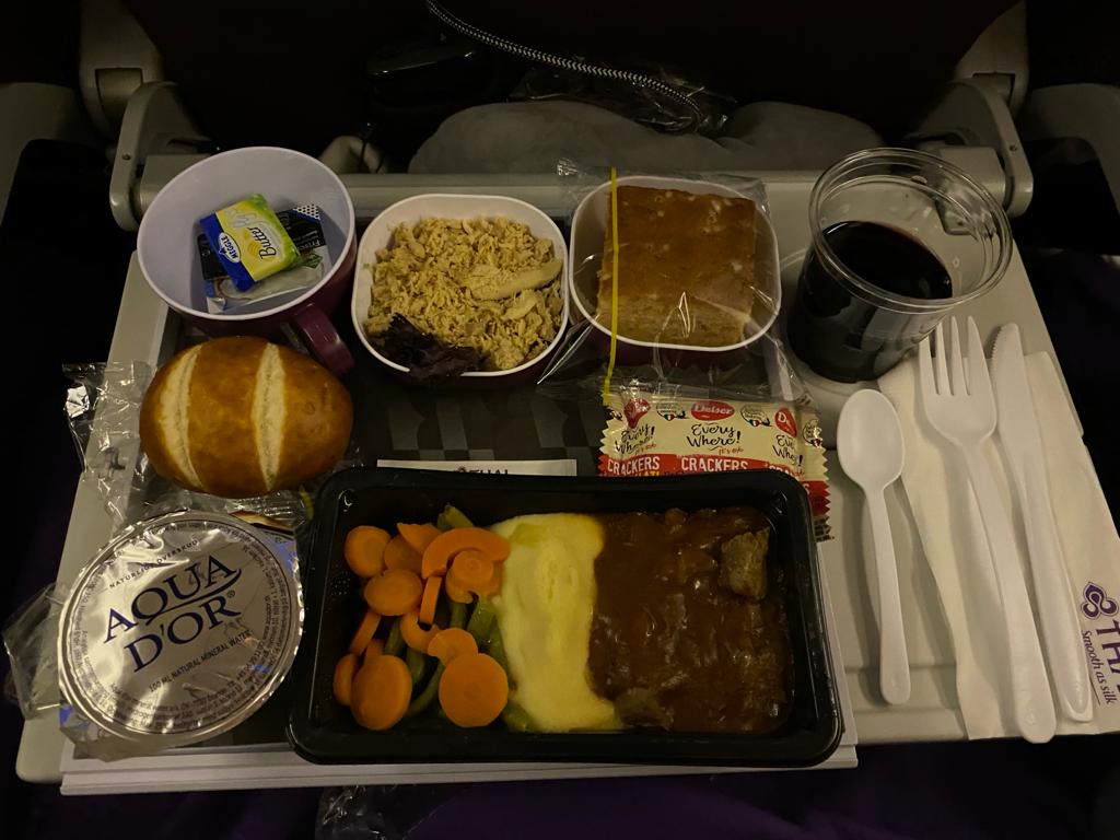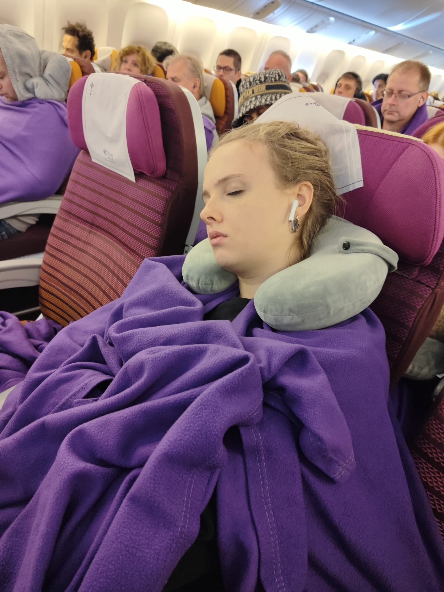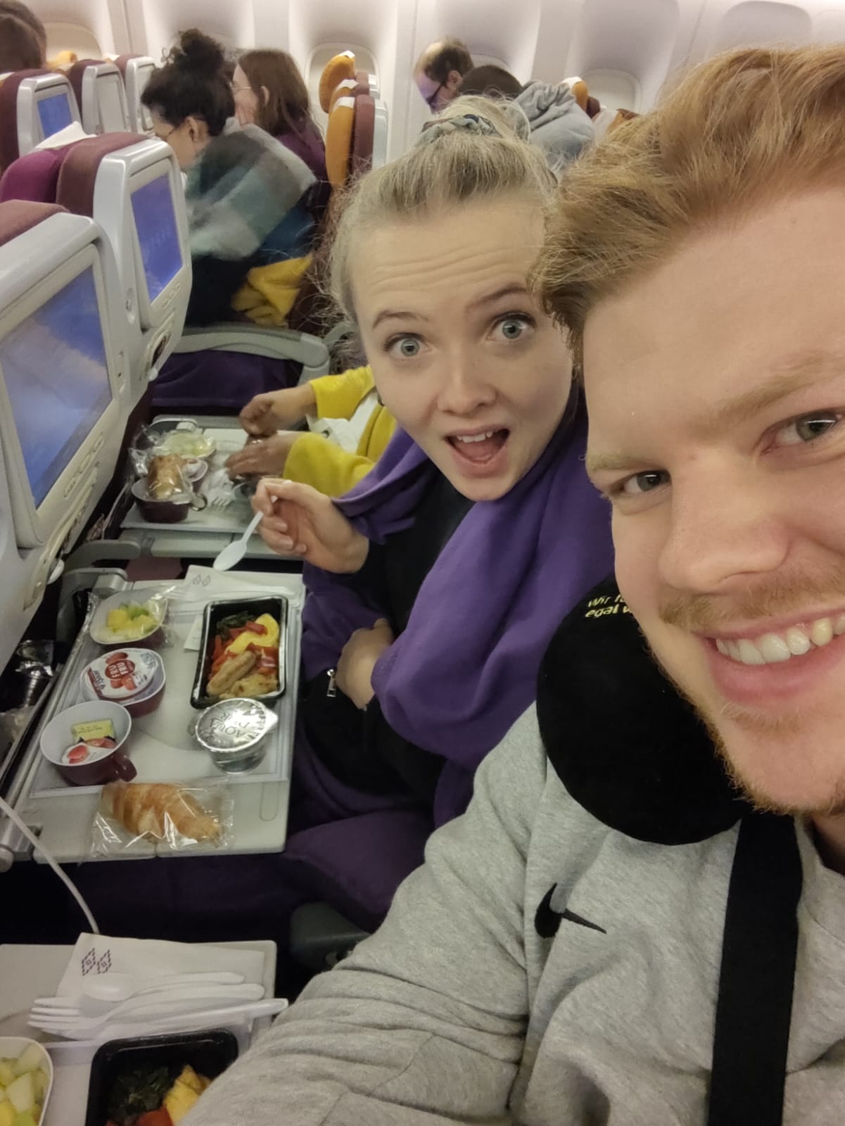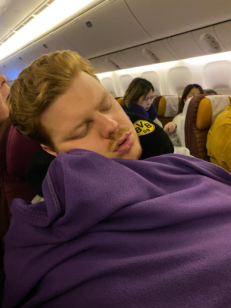 Nachdem wir auch beim Sicherheits-Check und bei der Passkontrolle stets auf die falsche Auswahl der Trikots hingewiesen wurden, ging es allmählich Richtung Gate und bei Flynn stieg der Ruhepuls in den gefühlt vierstelligen Bereich (Stichwort: Flugangst). Da konnte auch eine letzte klassische deutsche Mahlzeit in Form einer Knacker mit Senf und Brötchen sowie eine sehr bemühte und aufheiternde Neele nicht viel dran ändern. Spätestens beim Betreten des Flugzeuges wurde Flynn klar, dass es schon eher semi entspannt sein würde, mehr als 10 Stunden lang einen Herzschlag zu haben, der eher dem eines Touris in Berlin Montagmorgens im Berghain nach der dritten Kapsel gleicht. Die Lösung: Lorazepam. Die Wirkung: sehr stark und respekteinflößend… Sogar Schlaf war möglich. Von „Nachts im Museum“ und „James Bond“ ist nicht viel hängengeblieben. Wohl aber das fantastische Essen an Bord. Und das (Zitat Neele) „wunderschöne und freundliche Flugpersonal“. Alles in allem: Ein Bilderbuch-Flug.